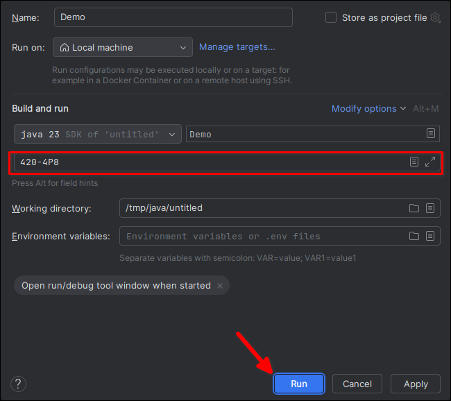 au bas de IntelliJ, taper java src/main/java/Demo.java et appuyer sur Entrer.